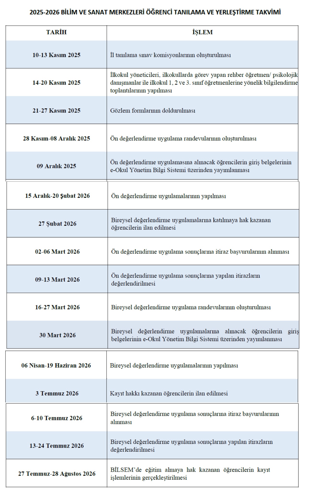 BİLSEM SINAVLARI 2025-2026 TAKVİM